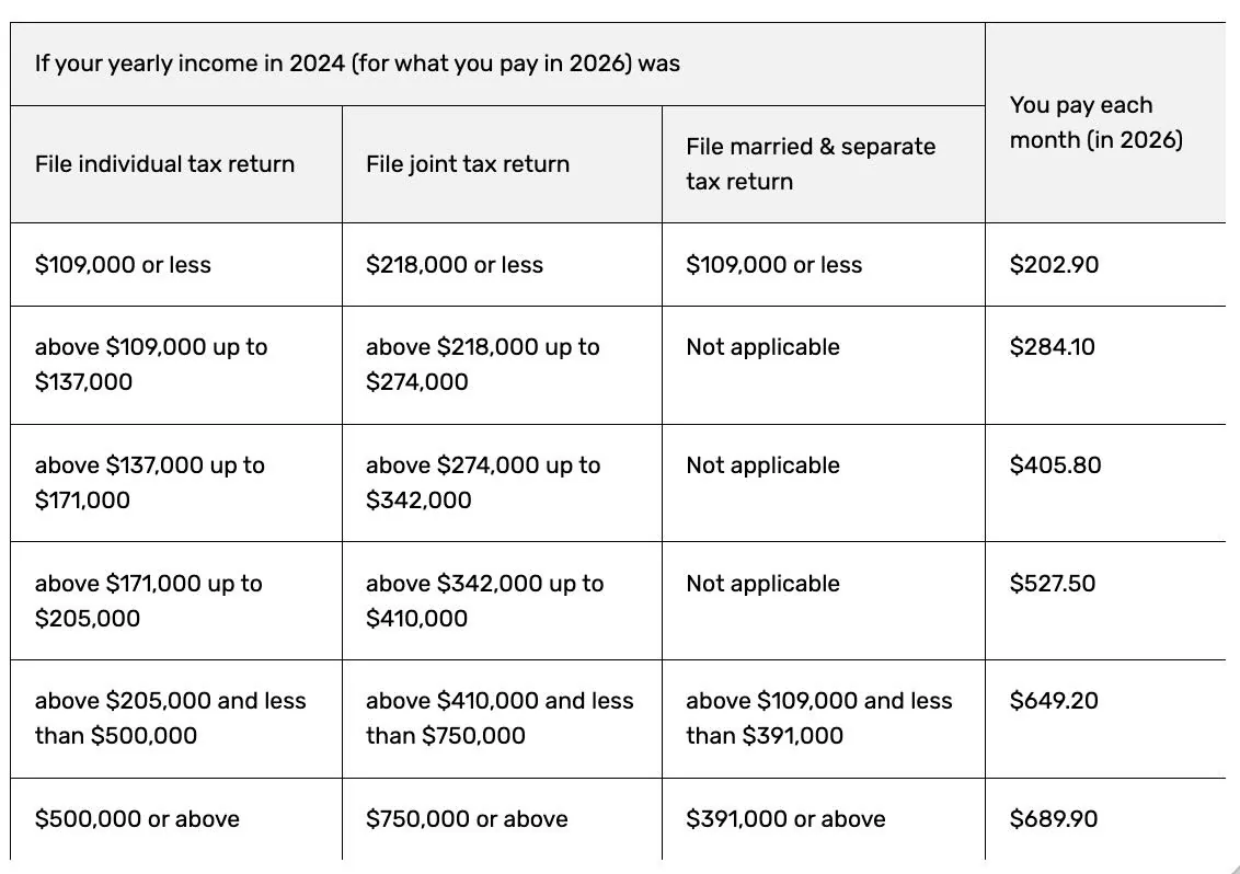 If your modified adjusted gross income, as reported on your IRS tax return from two years prior, exceeds a certain threshold, you’ll be subject to an income-related monthly adjustment amount in addition to the standard premium. This means you could end up paying more than the standard $202.90, and this amount can change annually.